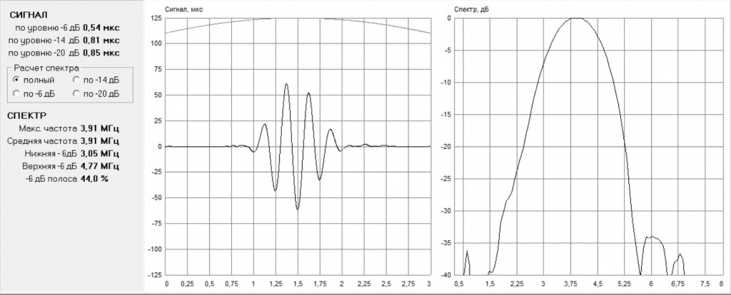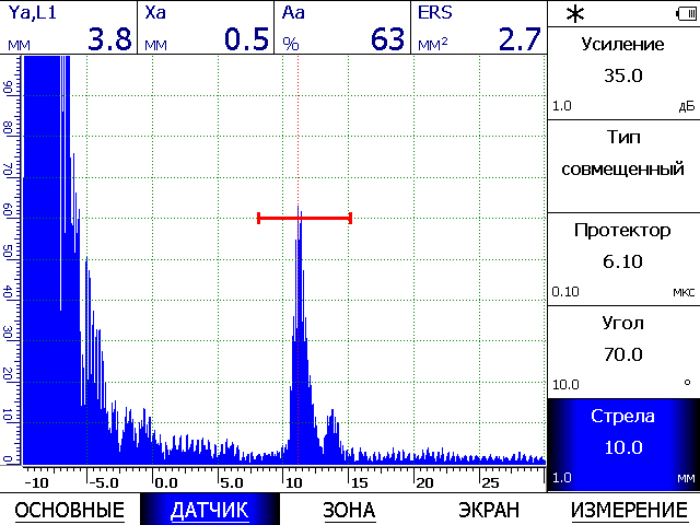 Эхо-сигнал от искусственного дефекта типа "зарубка" 1х1,3мм в образце толщиной 4мм ( УЗ дефектоскоп УСД-60)