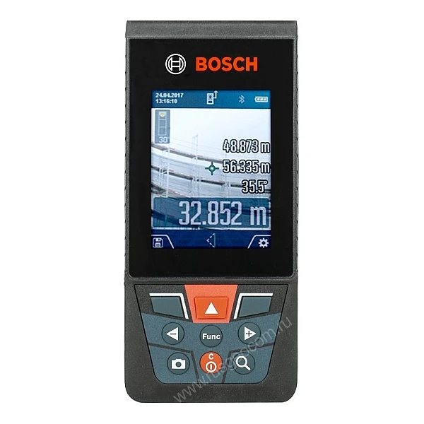 Лазерный дальномер Bosch GLM 120 C оснащен видеокамерой, работающей в видимом диапазоне. Ее можно использовать для точного наведения дальномера на цель при замерах на большом расстоянии. На экране отображается перекрестье, с помощью которого обозначается точка нахождения лазерного луча. Кроме того, камера дает возможность делать фотографии, после чего на ней проставляются нужные размеры.